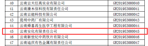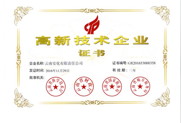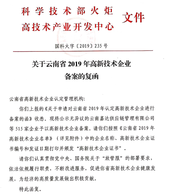 根據(jù)全國(guó)高新技術(shù)企業(yè)認(rèn)定管理工作領(lǐng)導(dǎo)小組辦公室《關(guān)于云南省2019年高新技術(shù)企業(yè)備案的復(fù)函》(國(guó)科火字﹝2019﹞235號(hào)),公司再次獲得“高新技術(shù)企業(yè)”稱號(hào)。