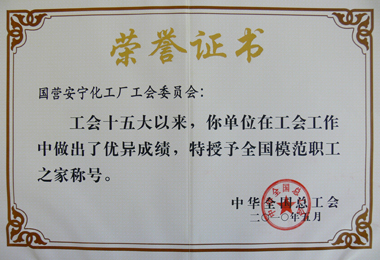 2010年5月,我廠榮獲中華全國(guó)總工會(huì)授予的 “全國(guó)模范職工之家”稱(chēng)號(hào),這是國(guó)家工會(huì)組織的最高榮譽(yù),是對(duì)于工會(huì)建設(shè)成果的最高獎(jiǎng)項(xiàng)。