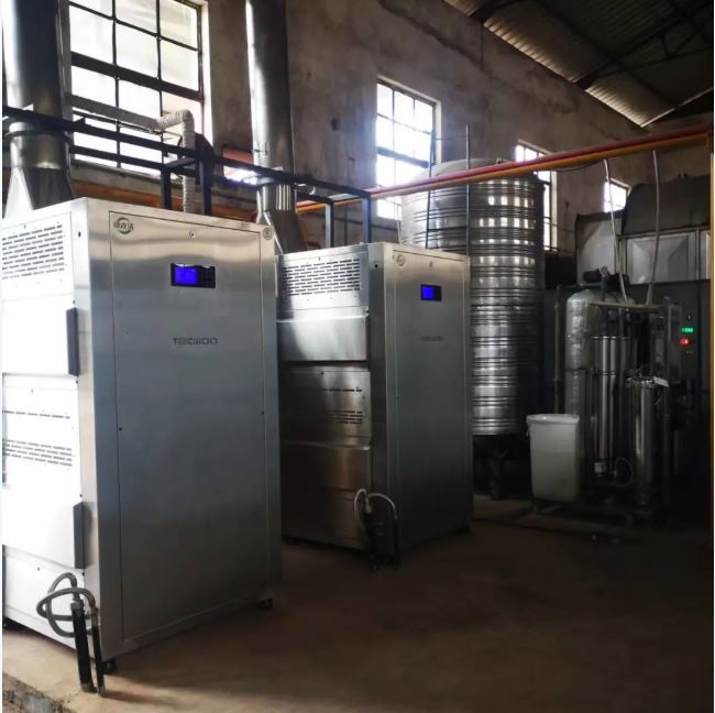 1.水變清了。燃煤鍋爐和烘干爐使用時(shí)排出的廢水含有煤渣、硫磺等物質(zhì)又黑又臭,需要經(jīng)過沉淀脫硫處理才能用于綠化。使用天然氣以后蒸汽熱源機(jī)采用純水機(jī)制備純水供給蒸汽熱源機(jī)使用,廢水為純水機(jī)工作產(chǎn)生的濃縮水,不需要任何處理直接可以用于綠化。原來收集鍋爐和烘干爐廢水的收集池由黑水池、臭水池變成了長滿青苔和水草的綠色水池。