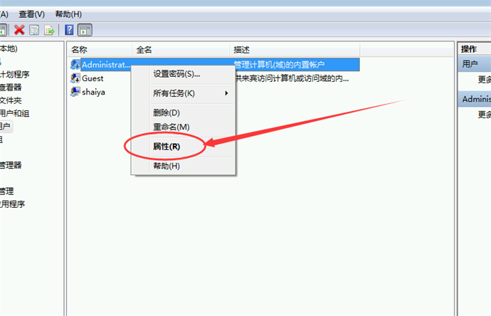 3、在右側(cè)的分組框內(nèi)選中超級管理員用戶(默認是Admonistrator,若操作系統(tǒng)使win7以上則選擇你自己設(shè)置的用戶),點擊鼠標右鍵,并點擊“屬性”按鈕;