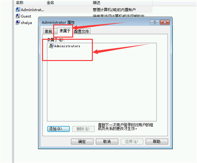 4、在選擇夾中選中“隸屬于”標簽,將除administrators外的所有用戶全部刪除;