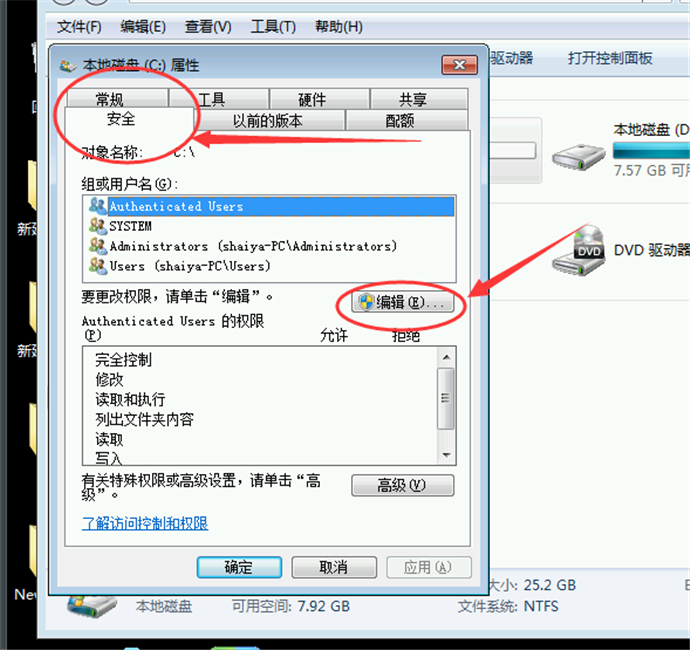 2、在彈出的選擇夾中選擇“安全”按鈕,并點擊“編輯”按鈕;